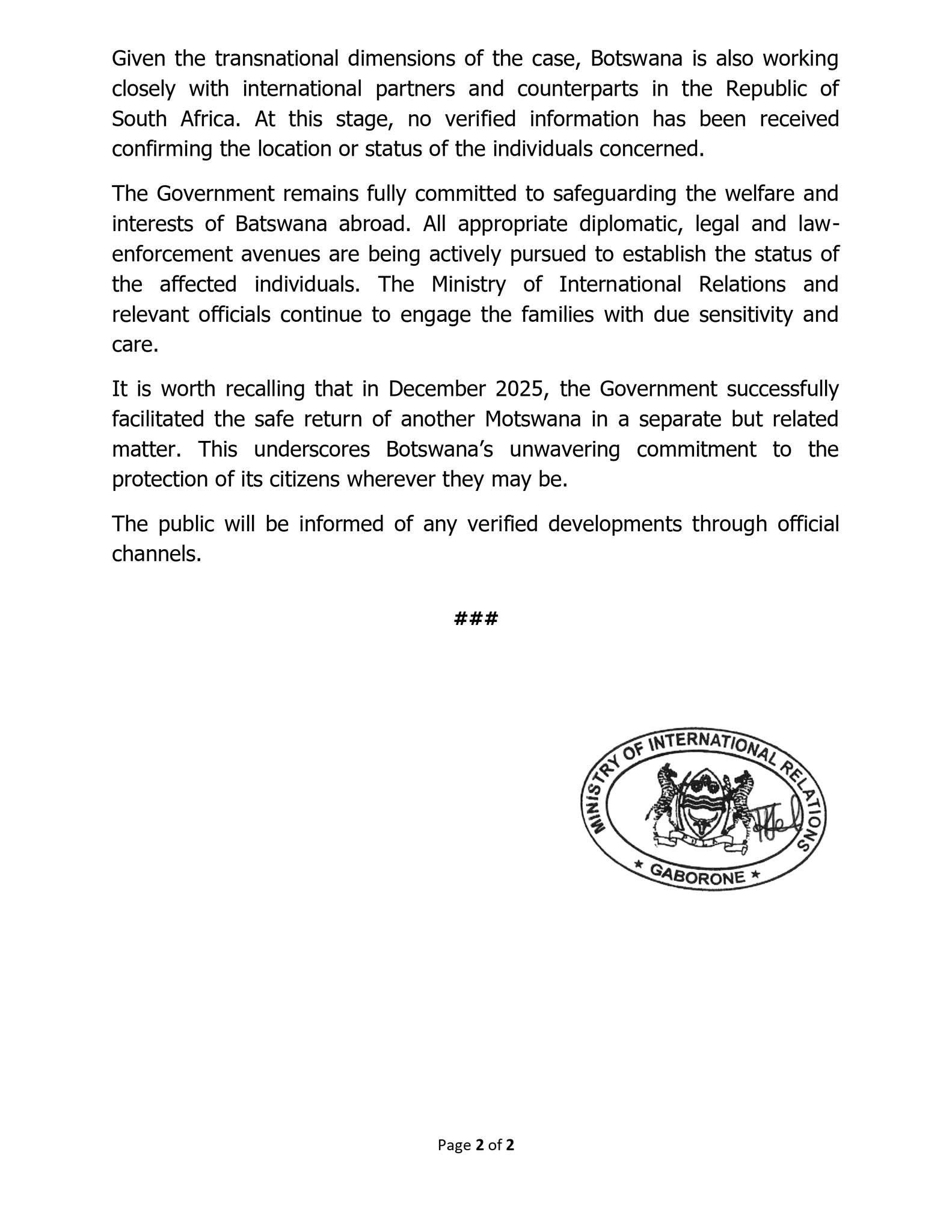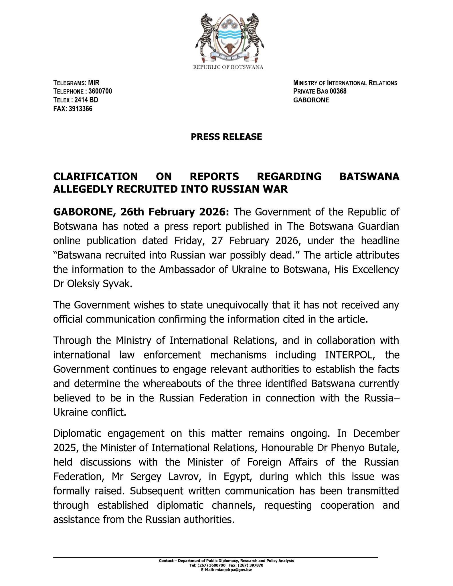 “Ukraine has taken note of the statement issued by the Ministry of International Relations of the Republic of Botswana on February 26th on reports regarding Batswana nationals recruited into Russia’s war against Ukraine. We welcome the efforts of Botswana’s government to engage with relevant authorities. Ukraine remains open to bilateral dialogue on this matter,” Sybiha stated.