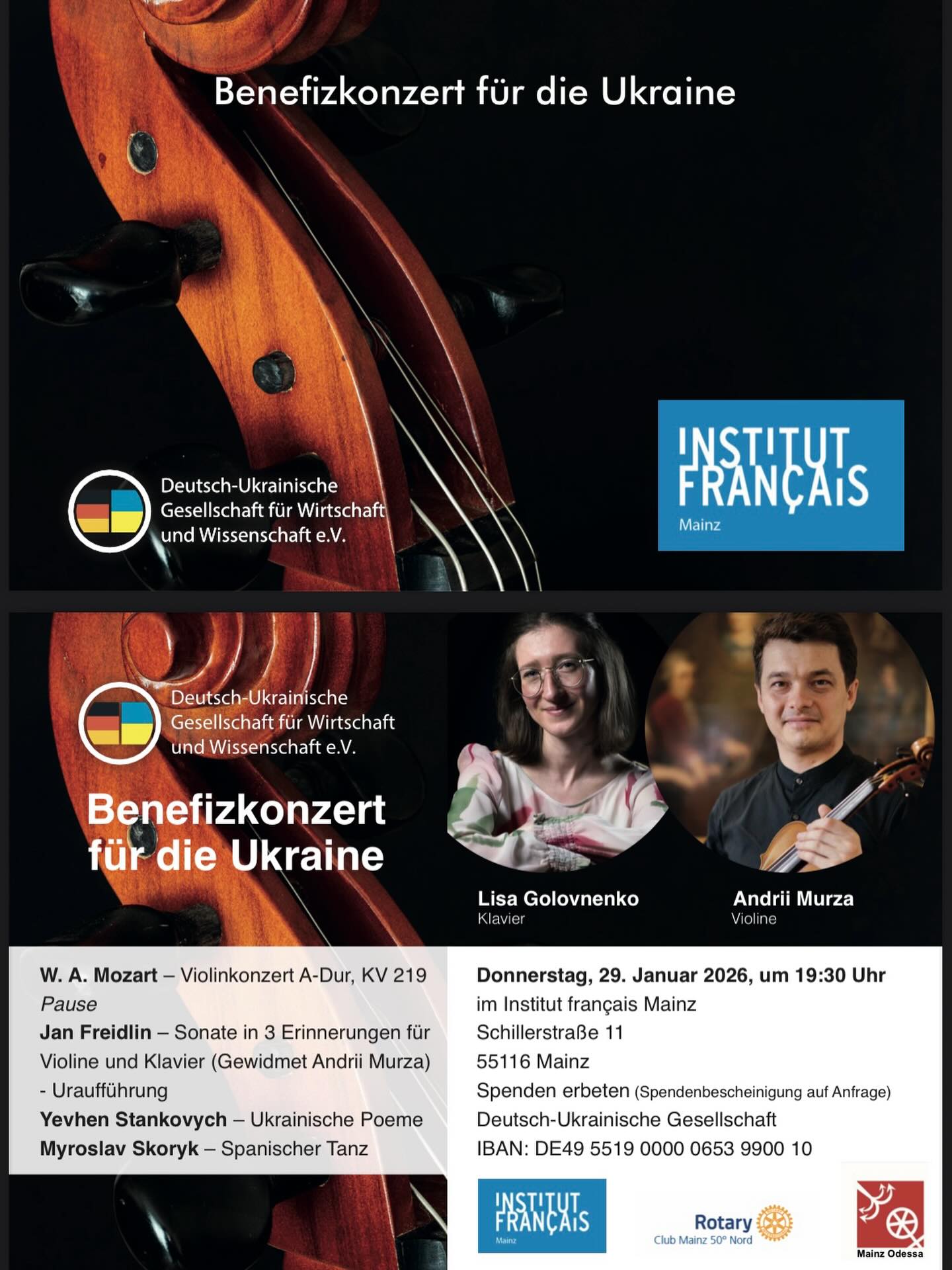 Organized by the German-Ukrainian Society for Economic and Scientific Affairs e.V., with support from the Mainz–Odessa partnership, the program will include masterpieces by Wolfgang Amadeus Mozart and works by prominent Ukrainian composers such as Yan Freidlin, Yevhen Stankovych, and Myroslav Skoryk.