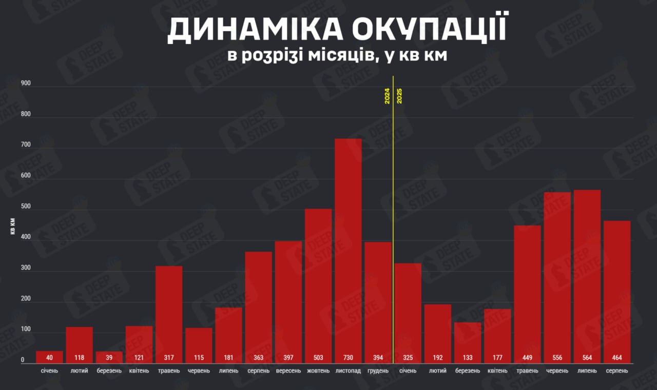 In August, the pace of occupation finally fell by 18, with the Russians occupying 464 square kilometers, as reported by Deep State.