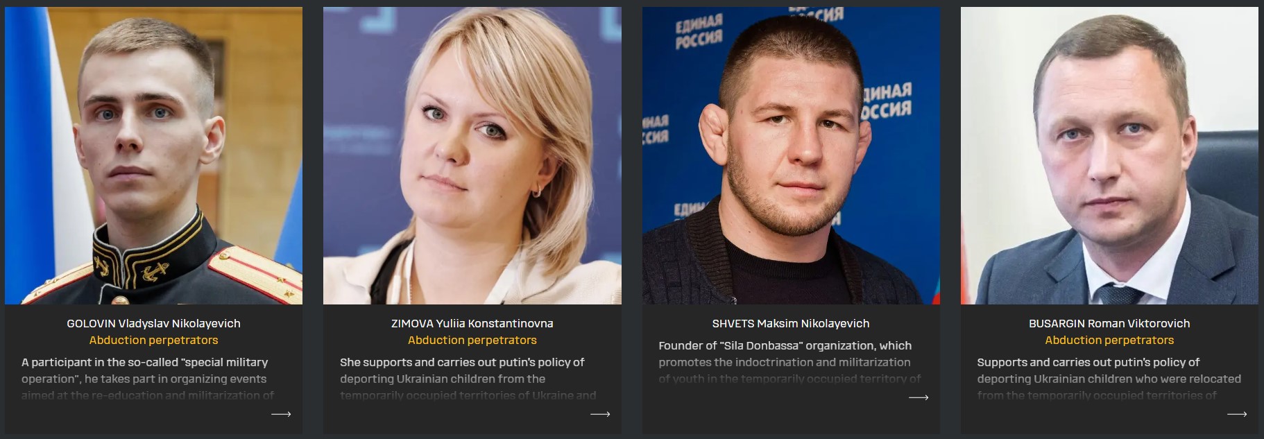 In the “Child Kidnappers” section of the War&Sanctions portal, data on seven individuals and three organizations were published, showing those who carry out the militarization of Ukrainian children and facilitate the illegal transfer of guardianship to Russian families.
