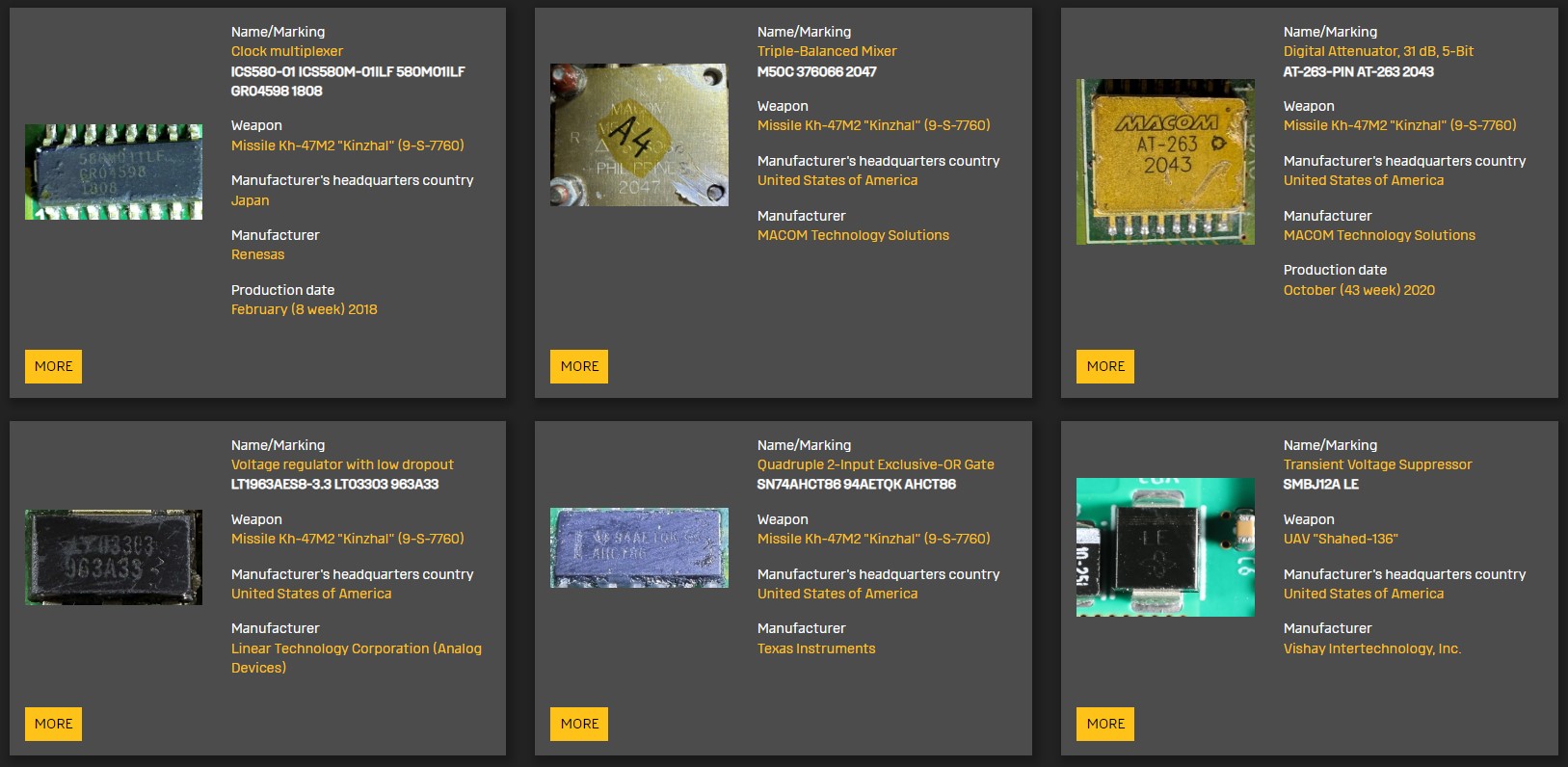 The “Components in weapons” section, which contains information on nearly 5,200 components across 179 weapon samples, is intended to help the civilized world in the technological disarmament of Russia.