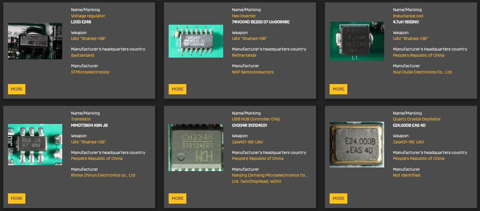 Main Intelligence Directorate of the Ministry of Defence of Ukraine, in the “Components in weapons” section on the War&Sanctions portal, is publishing information about 68 new components found in missiles and UAVs used by Russia against Ukraine.