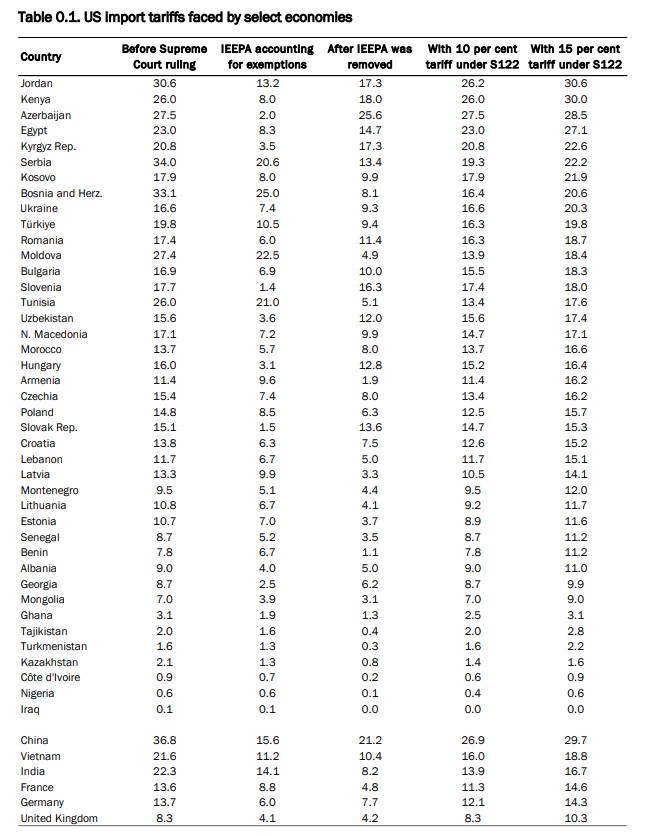 At the same time, some countries in the region benefited from the new regime. Tariff burdens fell by 12 percentage points for Bosnia and Herzegovina and Serbia, 9 points for Moldova, and 8 points for Tunisia. This is because these countries previously had much higher individual IEEPA tariffs, now replaced by a single flat rate.