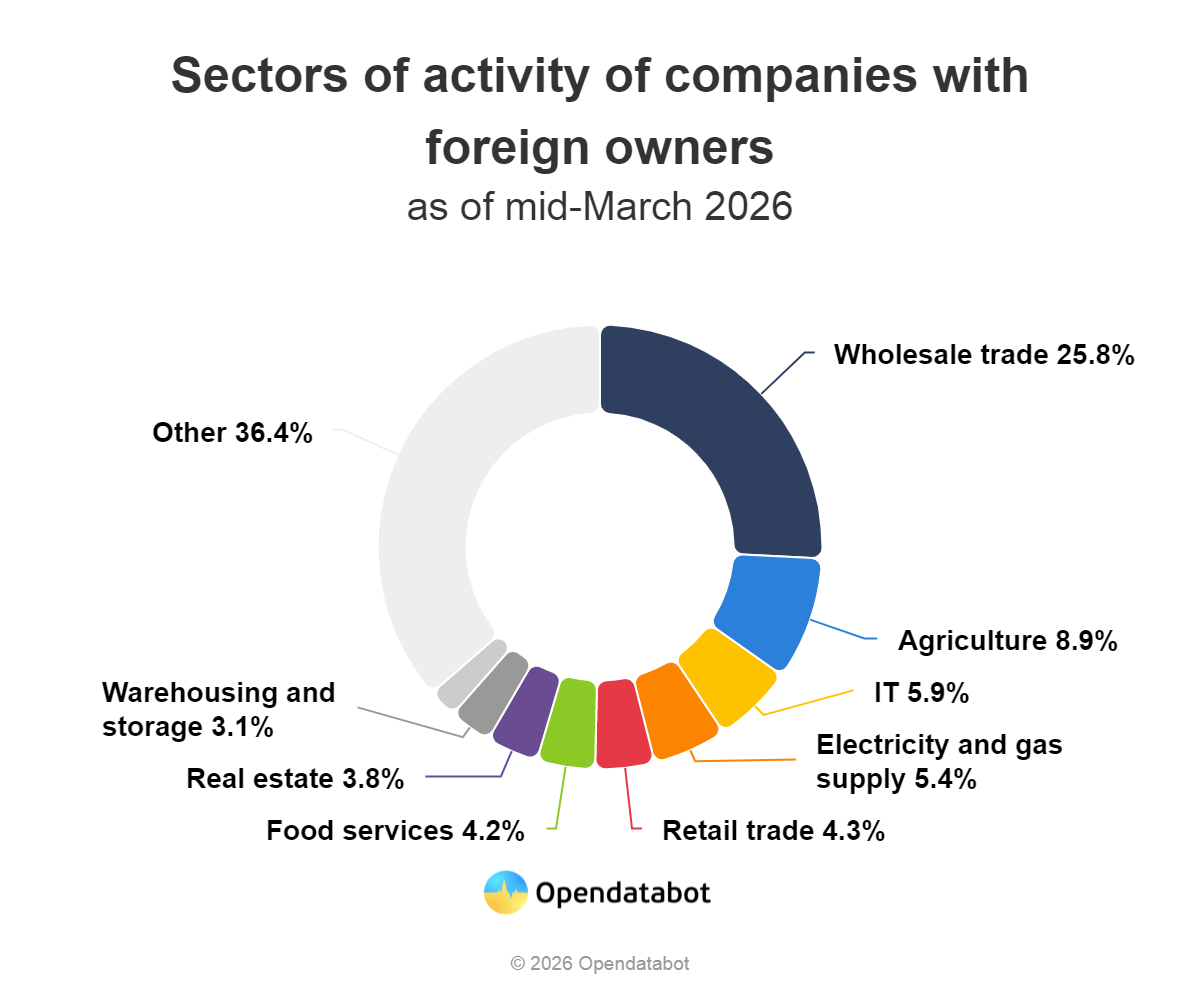 Foreign investors show a strong preference for certain sectors. Wholesale trade leads, with 774 companies, followed by agriculture (268) and IT (176). Cyprus and the Netherlands have long served as key hubs for structuring Ukrainian business ownership.