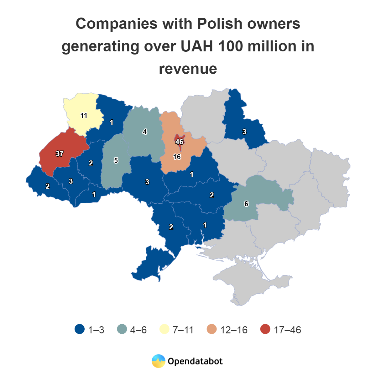 Around one-third of Polish-owned companies generating over UAH 100 million are based in Kyiv (46 companies), with another 16 located in the Kyiv region. The Lviv region accounts for 37 companies, followed by Volyn (11) and Dnipropetrovsk region (6).
