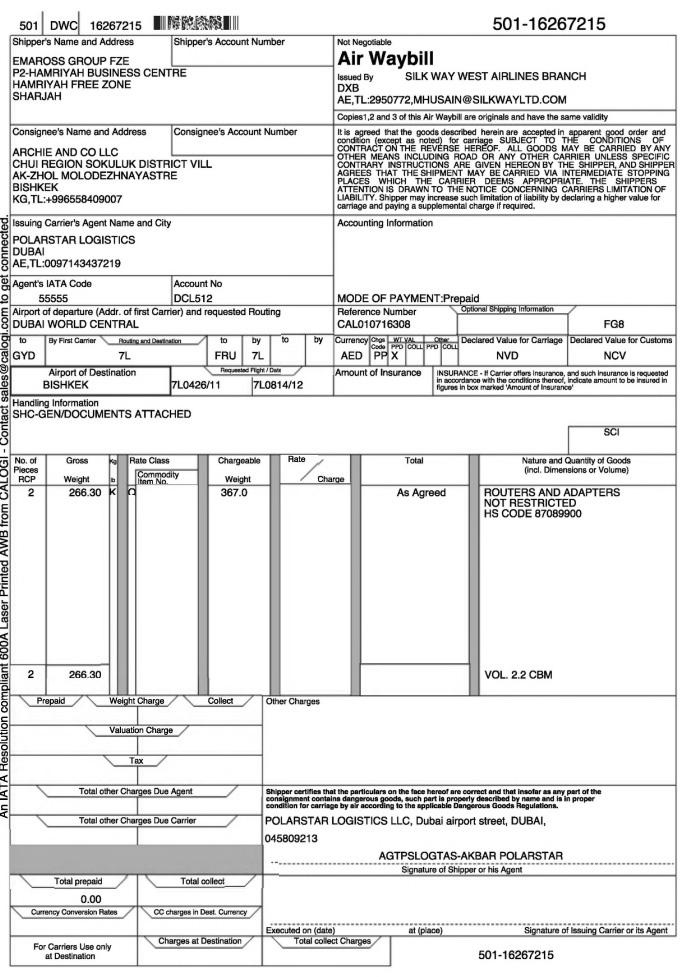 The author of the Nordsint investigation provided the international intelligence community InformNapalm with a copy of an air waybill obtained in response to a request from Emaross Group FZE. The document confirms the shipment of a batch of equipment from Dubai World Central in the United Arab Emirates to Bishkek, Kyrgyzstan, in May 2024—a route that has repeatedly appeared in re-export schemes to Russia.