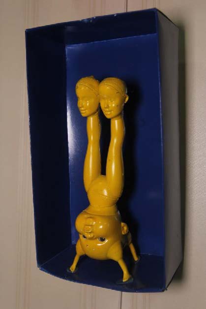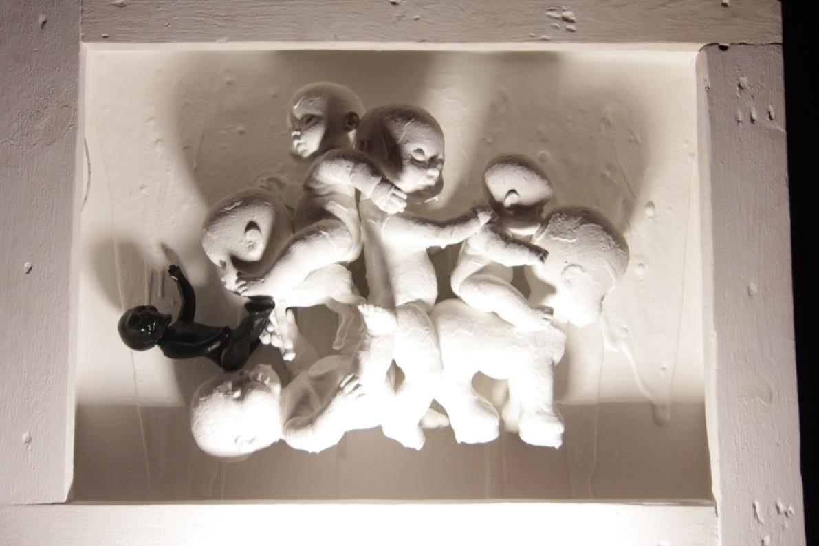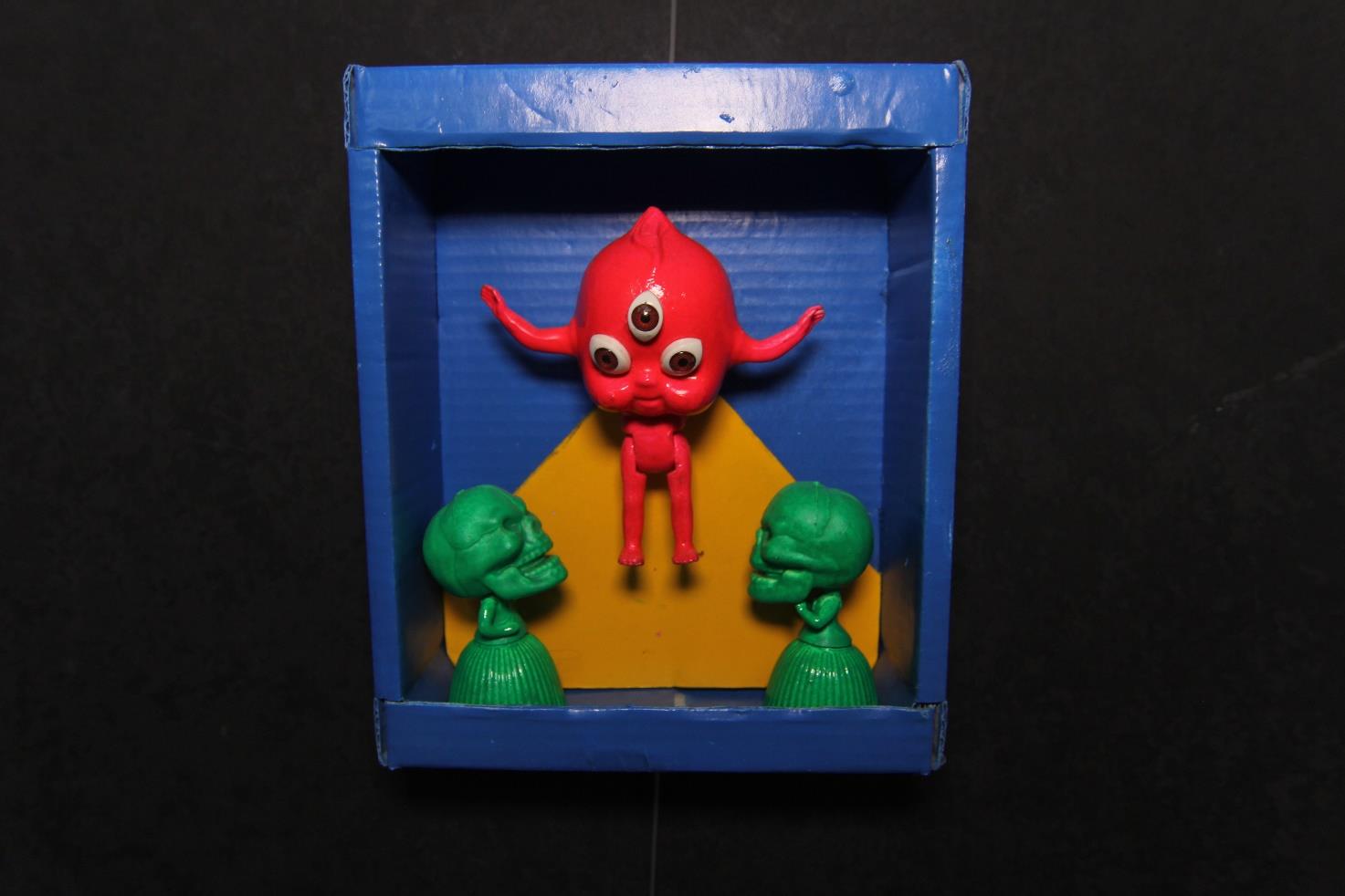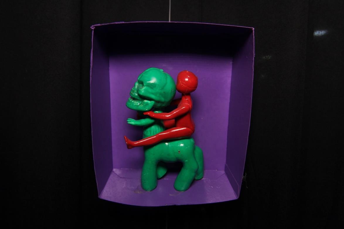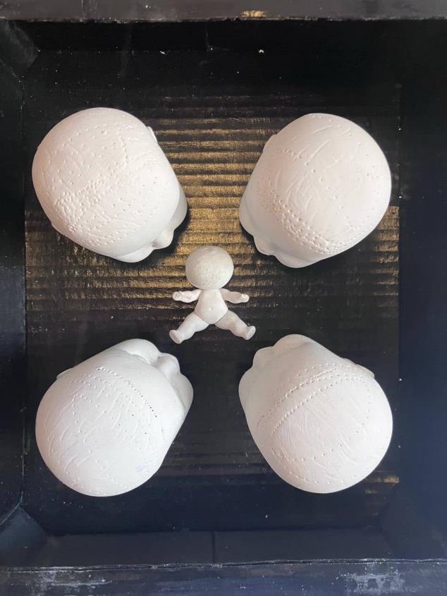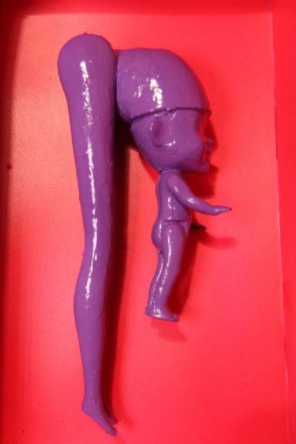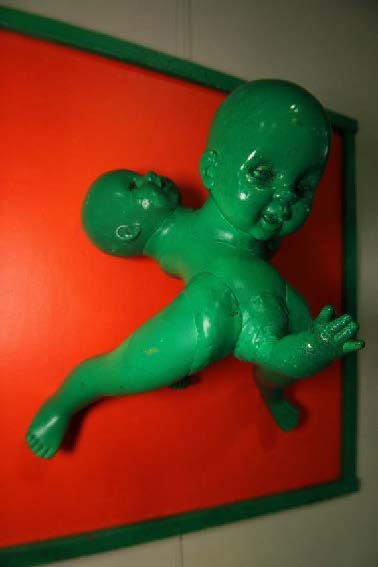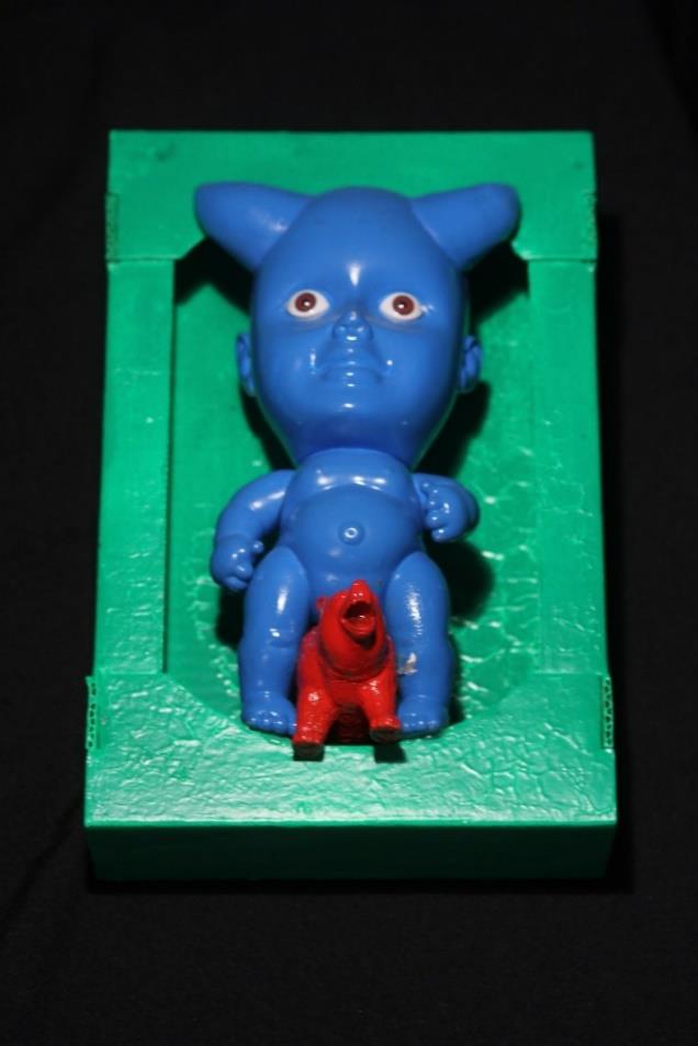Interestingly, some of my objects live their own lives. This very baby doll, without any physical cause, has already mystically jumped out of its frame several times. I could glue it dead tight, but it's much more fun this way."