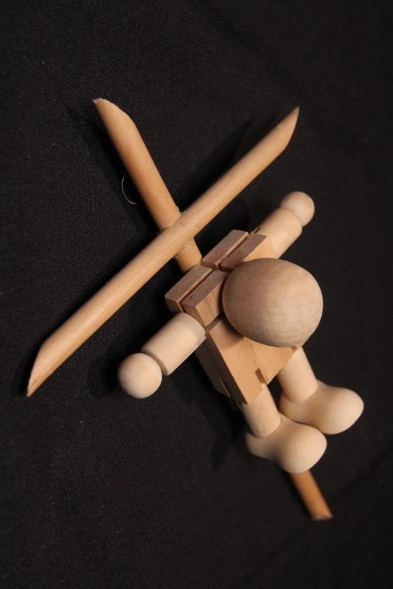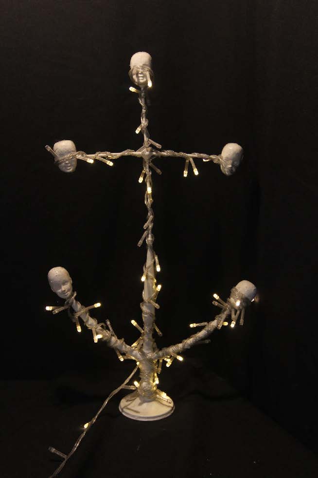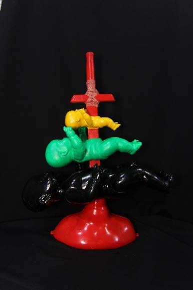 Artist's commentary: "The 'Heretical Crucifixes' series. The most important things are always hidden in plain sight. In my opinion, the main voodoo doll governing this world is the figure of Jesus on the cross. The essence of voodoo magic is to create a copy of a person and pierce it. Millions of people daily visualize a man nailed to boards. This mental magic is so habitual that no one thinks about its essence. Therefore, when blindly believing people ask why I crucify baby dolls, I remind them of what hangs in their temples."