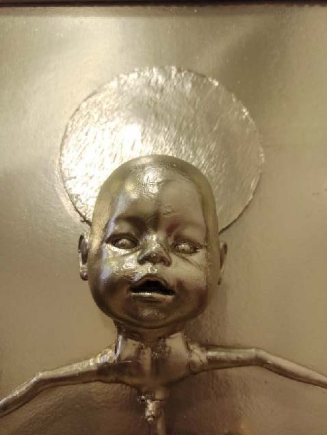 Artist's commentary: "This is the entire 'Heretical Icons' cycle. I am creating a new kind of art, so I invent the canons myself. In every doll, even an industrial one, lies an image of human likeness, and therefore — the image of God. The classic canon implies a halo: if you add it to a doll's head, it automatically becomes the head of a saint. An infant in arms is the Mother of God, multiple arms — a Deity.