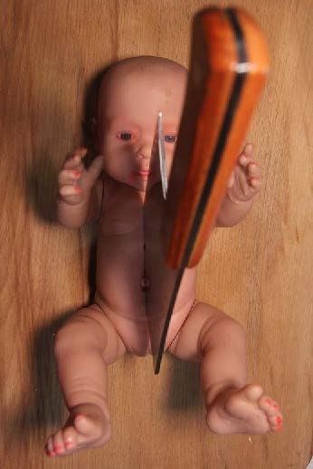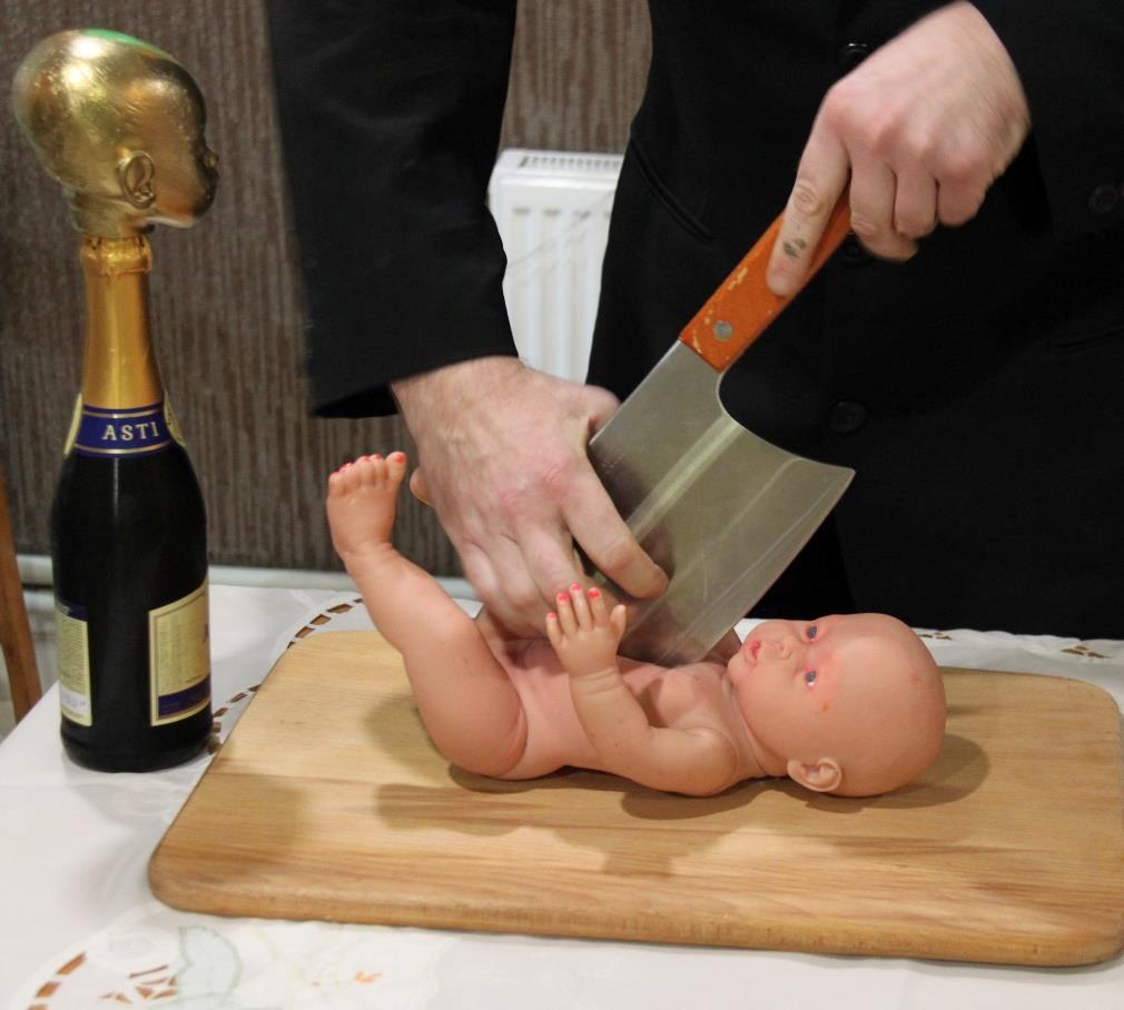 The art object itself is a diptych where a boy and a girl (dolls) lie on cutting boards under a sickle and a cleaver. At the opening of my first exhibition, I placed this installation right on the buffet table, among meat and sausage, reminding guests that the intellect of a piglet is equal to the intellect of a two-year-old child. Narrow-minded people immediately accused me of Satanism. But I maintain: the real Satanists are those who keep dismembered corpses in their refrigerators and consider it the norm."