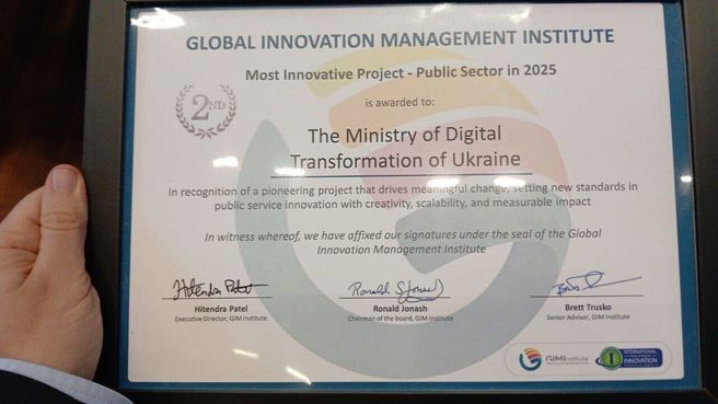 The Diia.Engine team received a prestigious international award for achievements in the field of public innovation. The Diia.Engine project took second place at the GIMI Awards 2025 in the category “Most Innovative Project – Public Sector.”