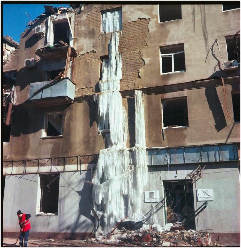 Blocks of ice from the windows. March 2022. Kharkiv. City center. Slide film. Size 20x20cm.