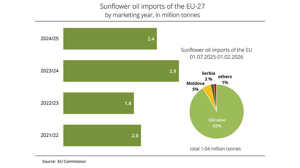 A report by the German Union for the Promotion of Oil and Protein Plants (UFOP) shows that during the first seven months of the 2025–2026 marketing year (July–June), EU-27 countries imported just under 1.04 million tons of sunflower oil. While Ukraine retained its leading position, the total import volume declined from 1.28 million tons during the same period last year.