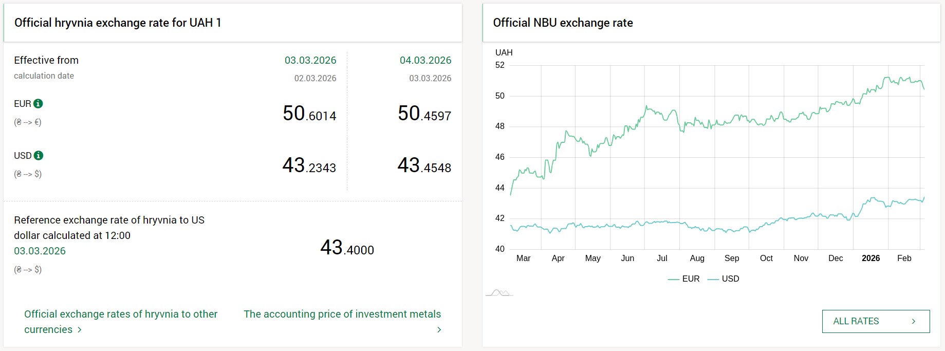 - 1 US dollar – 43.45 UAH (43.23 UAH as of March 3)