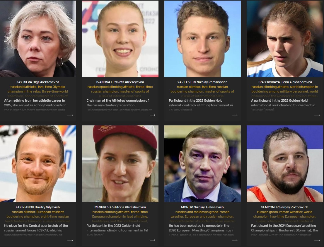- Yelizaveta Ivanova, Mykola Yarylovets, Olena Krasovska, Dmytro Fakirianov, Viktoriia Meshkova – members of the climbing national team who visited temporarily occupied territories of Ukraine but continue to compete internationally, including under a “neutral” status recognized by the International Federation of Sport Climbing;