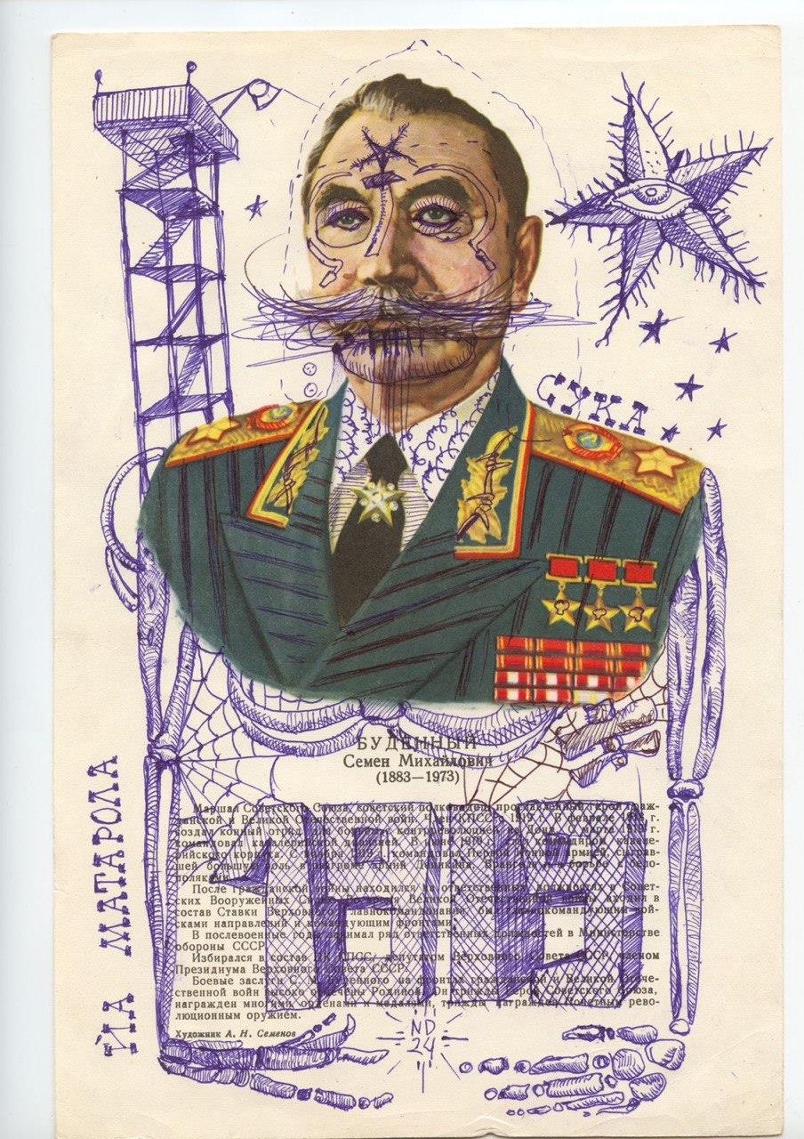 But even in the service, creativity found a way out. Finding himself in an army environment, Denys turned restrictions into an artistic device. Thus, right in the classrooms, his sharp graphic series "Motorola 1917" was born. Using pages from found old Soviet textbooks on pre-conscription training as a canvas, he deconstructs imperial myths, overlaying the propaganda of the past with images of the real war. This is art of direct action — created by a soldier in the intervals between performing combat tasks.