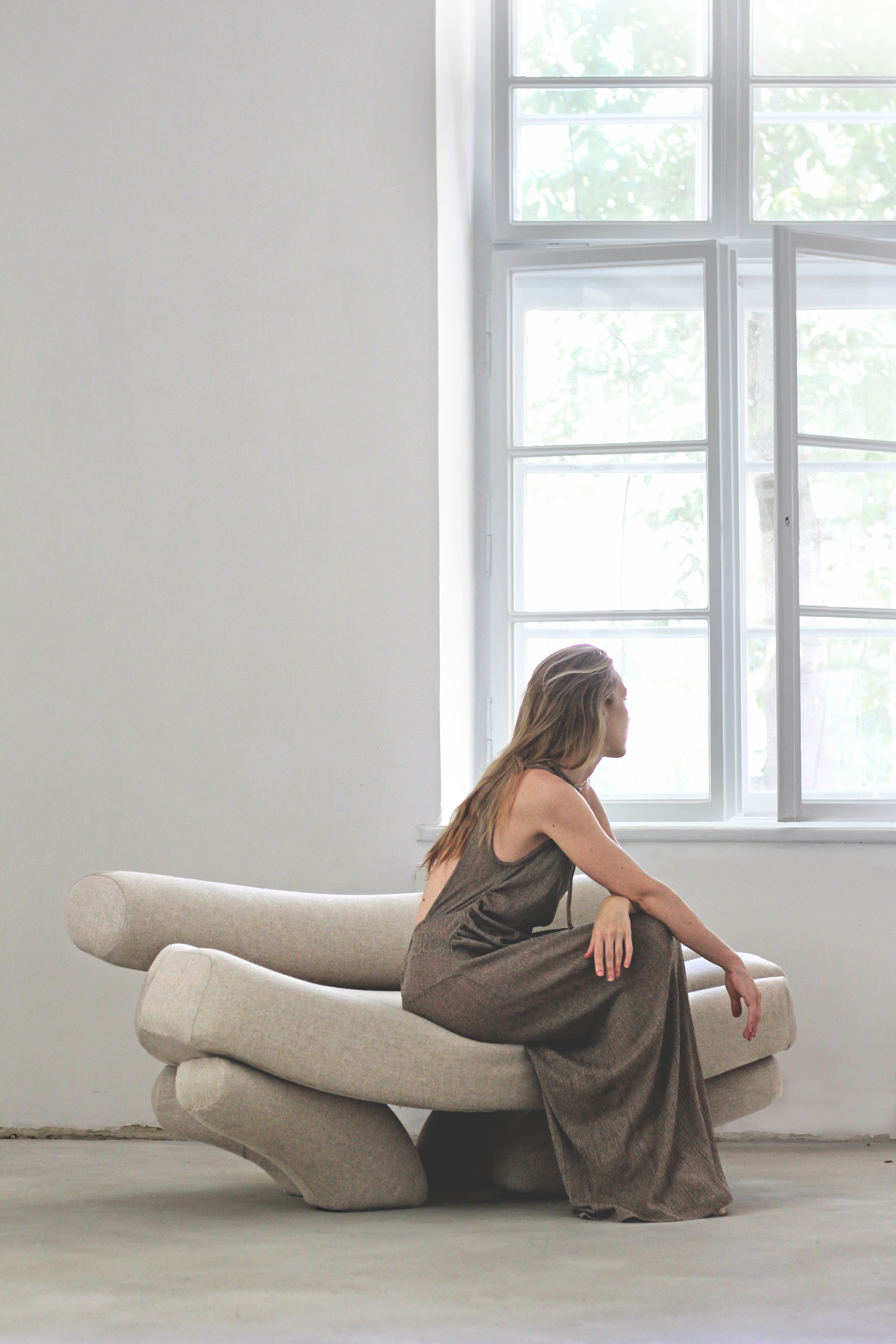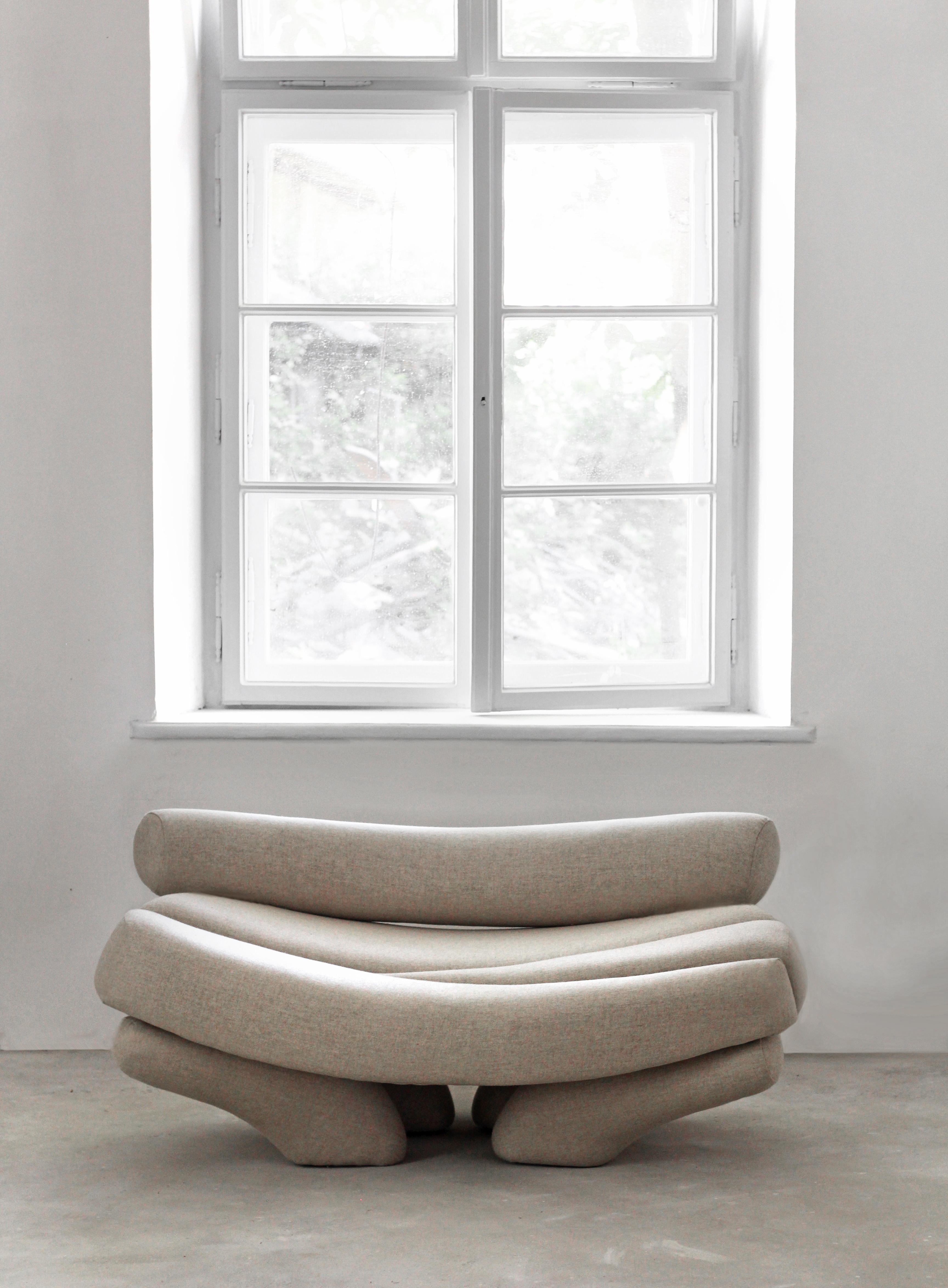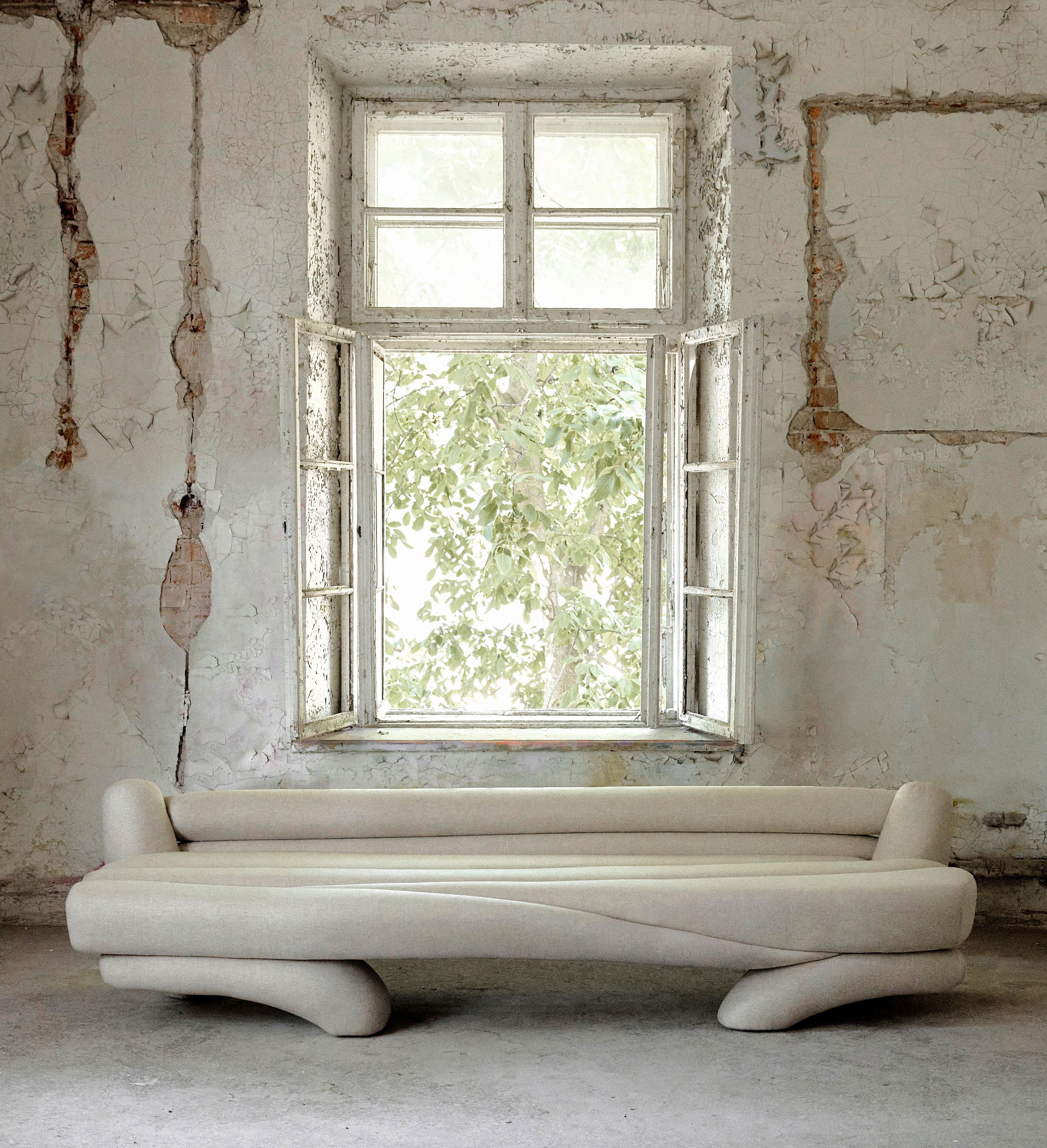The collection includes a chair, bed, bench, and a sculptural sofa, which serves as the centerpiece. Its form, reminiscent of horns, evokes an archaic and primal aesthetic, linking the untamed energy of nature with a timeless sense of presence.